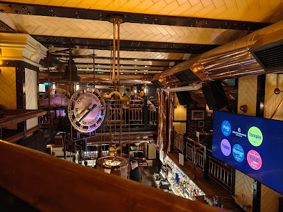 Large pub with gleaming copper pipes, imported draught beers and late-night basement music club.